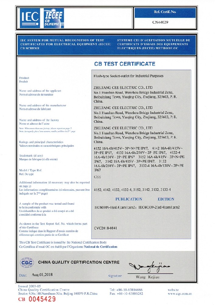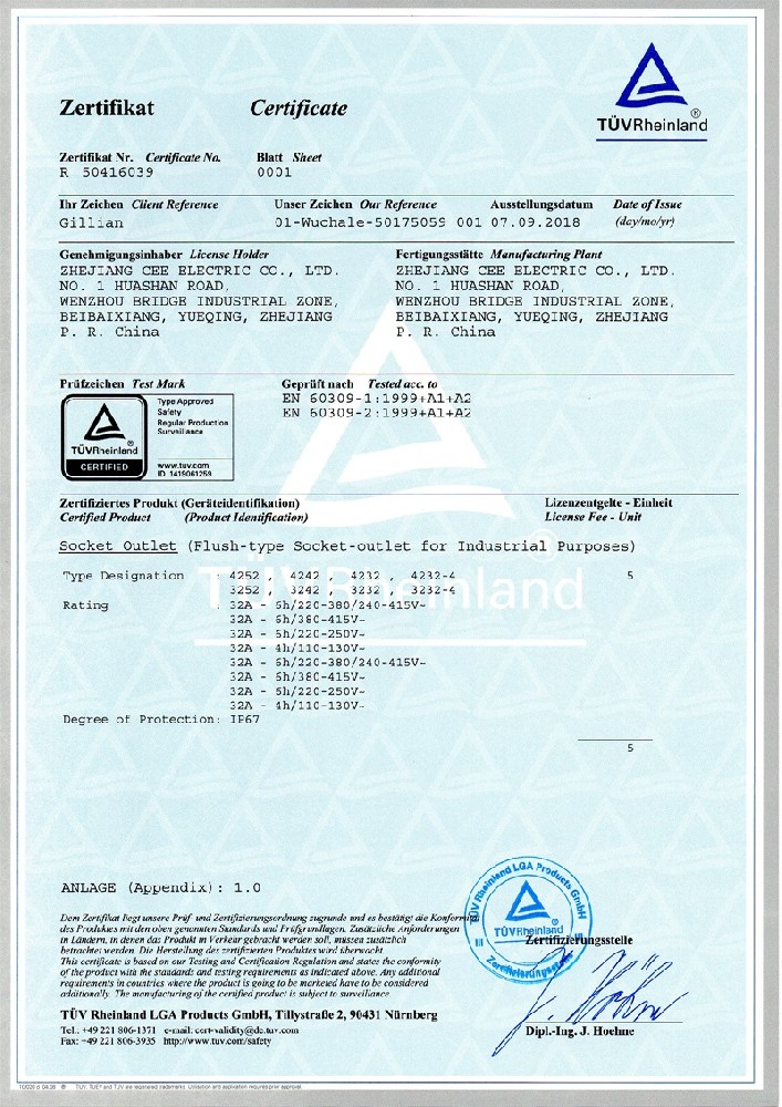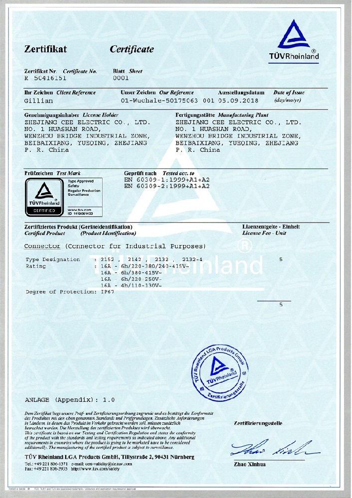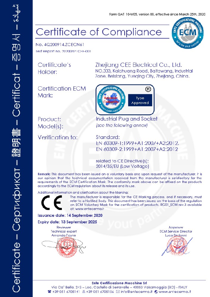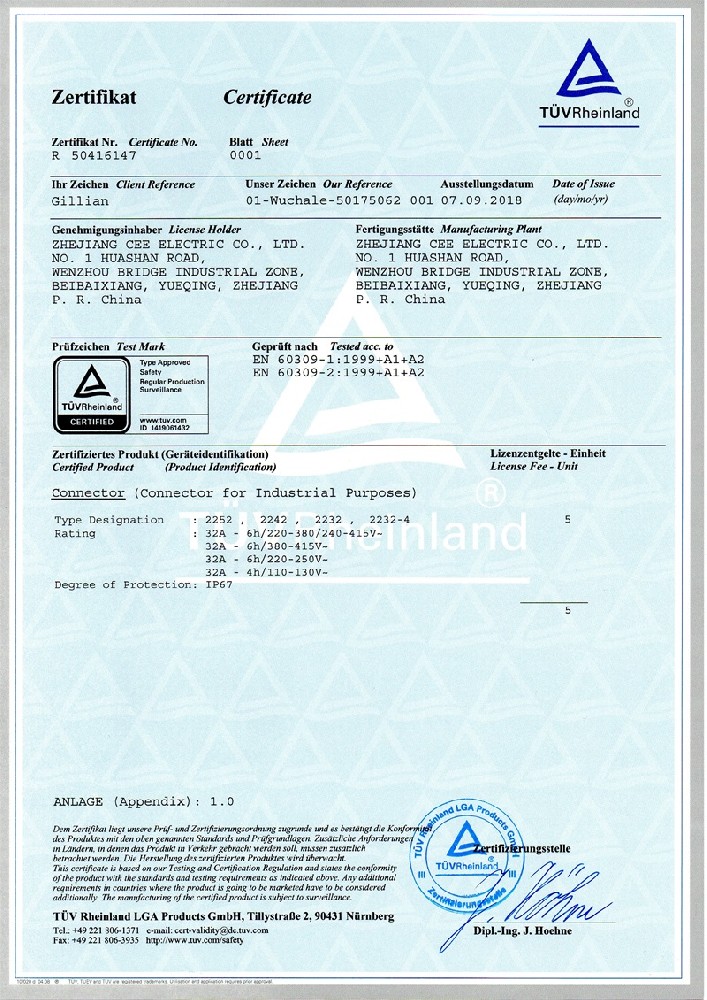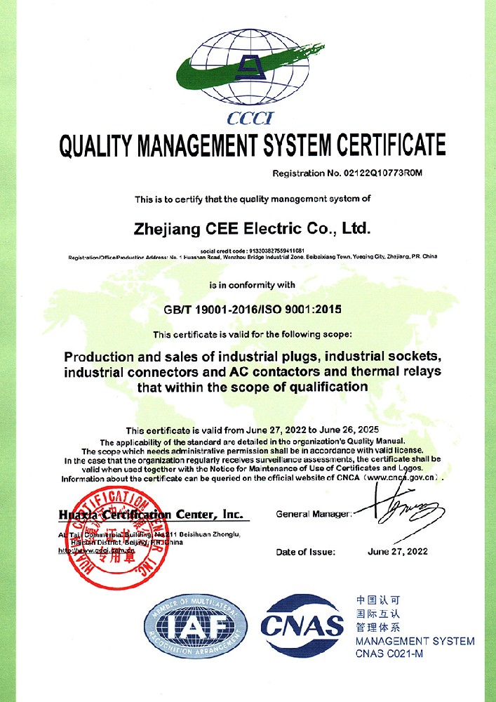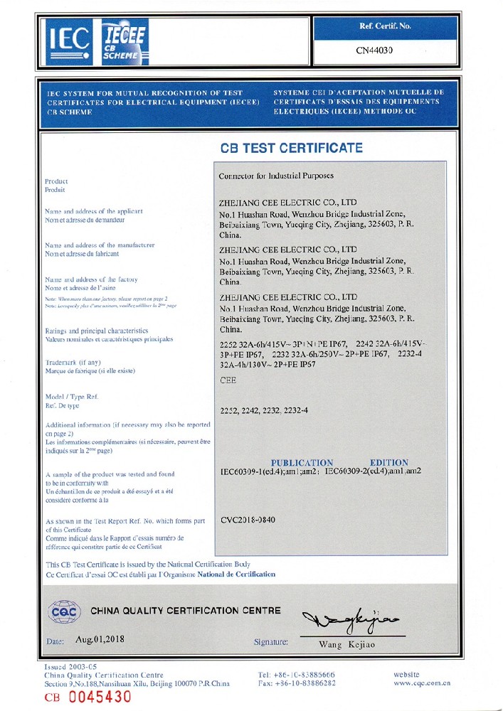公司全面貫徹實(shí)施IS09001:2015質(zhì)量管理體系認(rèn)證。工業(yè)插頭插座符合IEC 603 09-1-2, EN 60 309-1-2國(guó)際標(biāo)準(zhǔn), 組合插座箱符合EN61439標(biāo)準(zhǔn),并通過(guò)Intertek & TUV Rheinland & CQC等認(rèn)證。證書(shū)包括TUV、SEMKO、CE、CB、EAC,并符合RoHS和Reach等適用法規(guī)。公司引進(jìn)先進(jìn)生產(chǎn)設(shè)備和精密檢測(cè)試驗(yàn)儀器、不斷引入高科技工藝流程和技術(shù)人才,為公司的產(chǎn)品研發(fā)、質(zhì)量升級(jí)、管理創(chuàng)新提供了強(qiáng)有力的保障。公司將持續(xù)以優(yōu)質(zhì)的產(chǎn)品和服務(wù),贏得客戶的最大滿意為宗旨,發(fā)揚(yáng)“創(chuàng)新、服務(wù)、溝通”的企業(yè)精神,力促CEE品牌從中國(guó)走向世界。我們牢牢把握時(shí)代賦予的使命和機(jī)遇,與海內(nèi)外合作伙伴共同開(kāi)創(chuàng)事業(yè)的新高度。