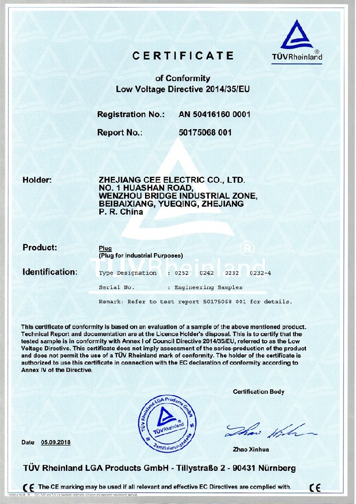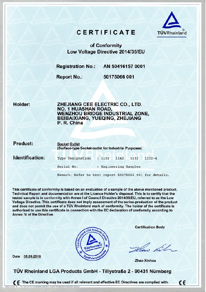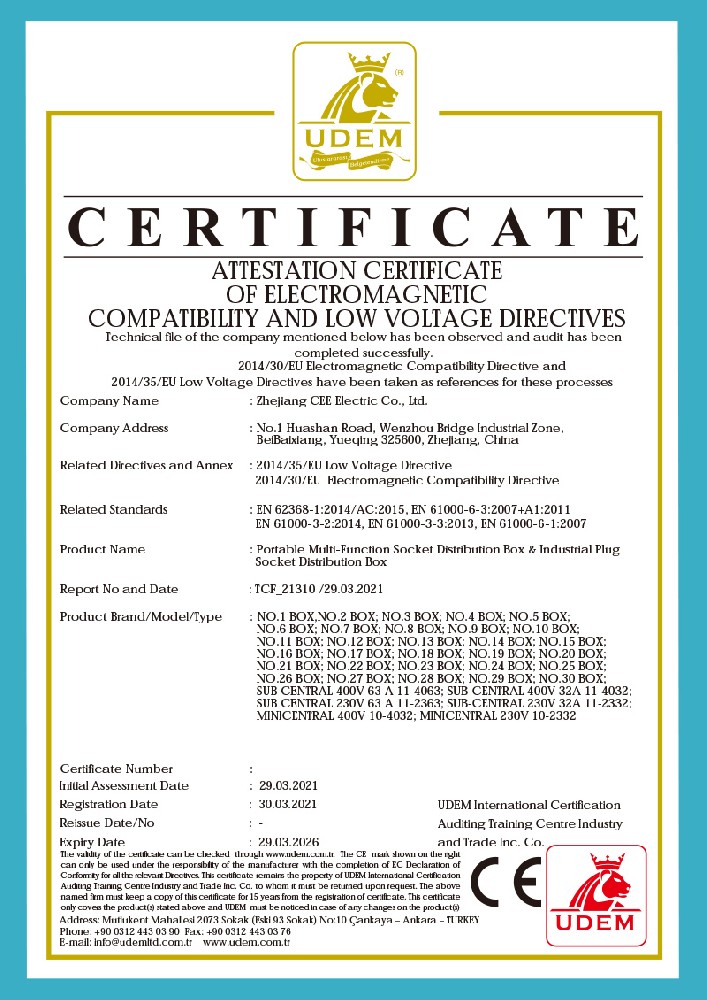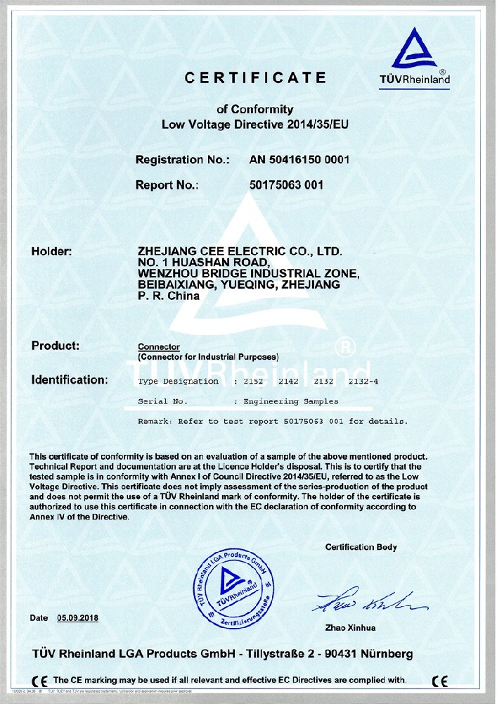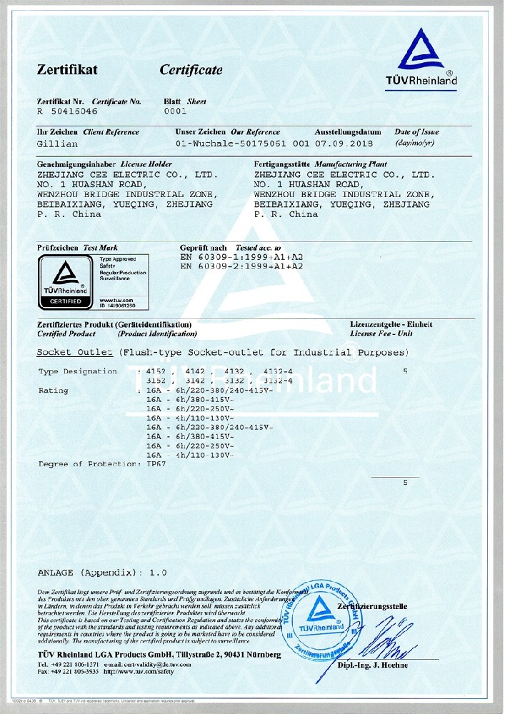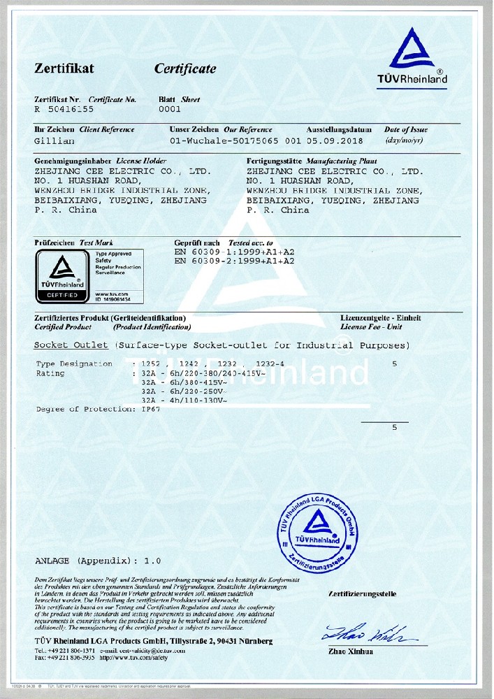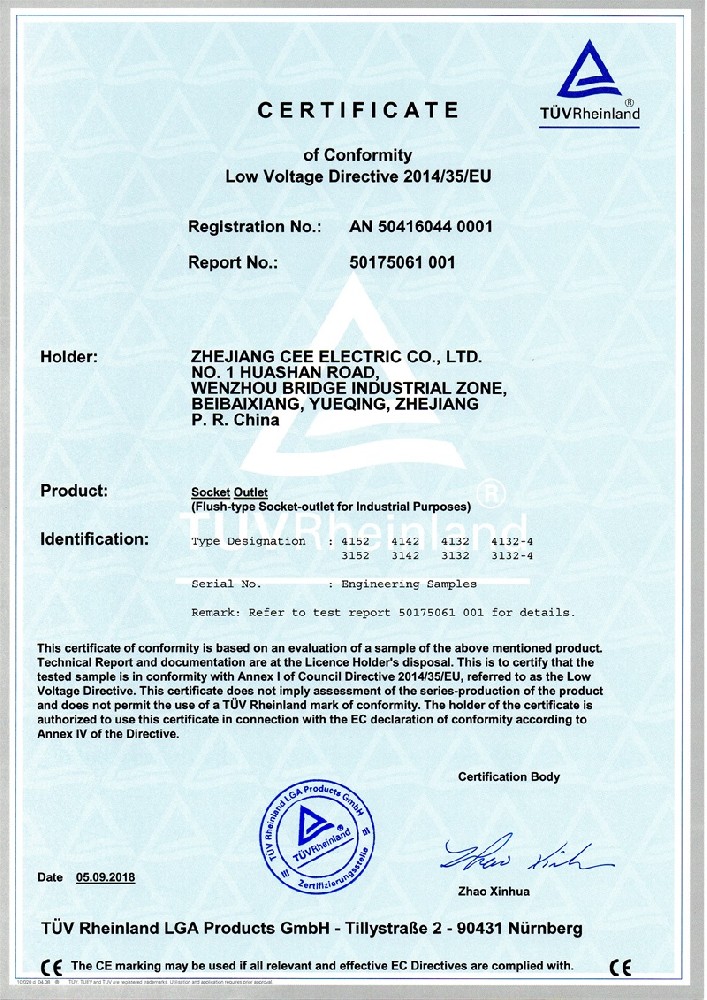 公司全面貫徹實(shí)施IS09001:2015質(zhì)量管理體系認(rèn)證。工業(yè)插頭插座符合IEC 603 09-1-2, EN 60 309-1-2國(guó)際標(biāo)準(zhǔn), 組合插座箱符合EN61439標(biāo)準(zhǔn),并通過(guò)Intertek & TUV Rheinland & CQC等認(rèn)證。證書(shū)包括TUV、SEMKO、CE、CB、EAC,并符合RoHS和Reach等適用法規(guī)。公司引進(jìn)先進(jìn)生產(chǎn)設(shè)備和精密檢測(cè)試驗(yàn)儀器、不斷引入高科技工藝流程和技術(shù)人才,為公司的產(chǎn)品研發(fā)、質(zhì)量升級(jí)、管理創(chuàng)新提供了強(qiáng)有力的保障。公司將持續(xù)以優(yōu)質(zhì)的產(chǎn)品和服務(wù),贏得客戶的最大滿意為宗旨,發(fā)揚(yáng)“創(chuàng)新、服務(wù)、溝通”的企業(yè)精神,力促CEE品牌從中國(guó)走向世界。我們牢牢把握時(shí)代賦予的使命和機(jī)遇,與海內(nèi)外合作伙伴共同開(kāi)創(chuàng)事業(yè)的新高度。
