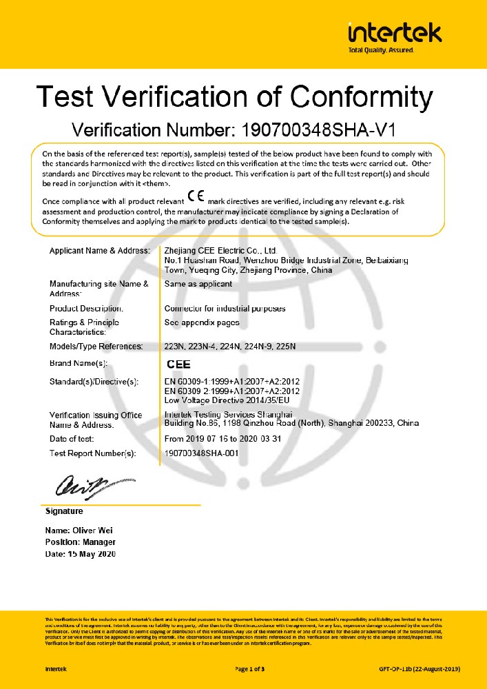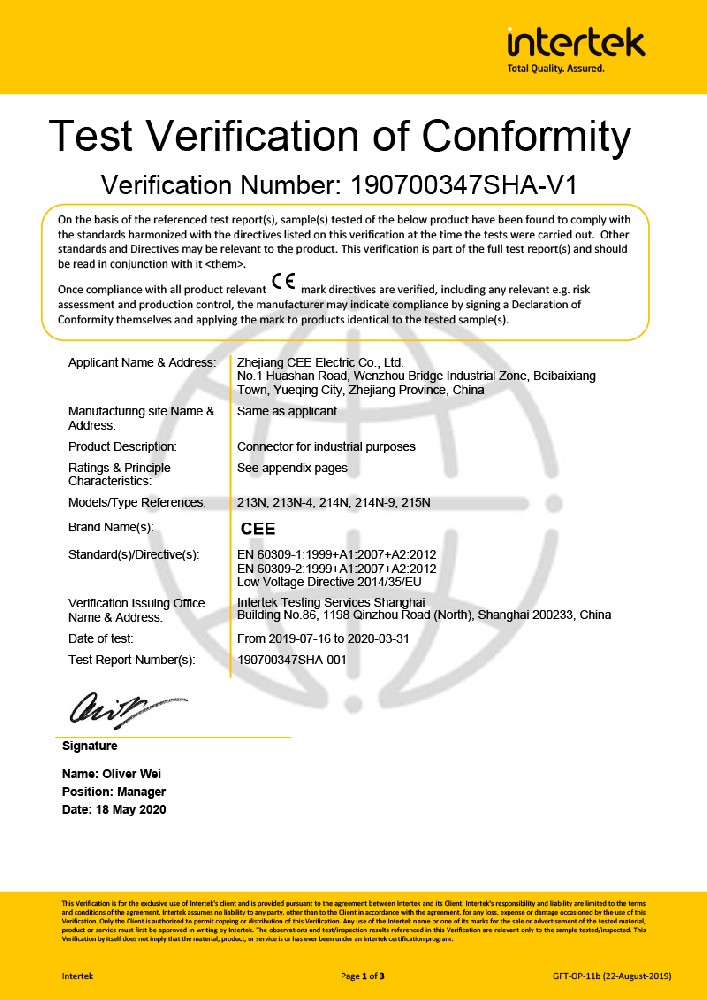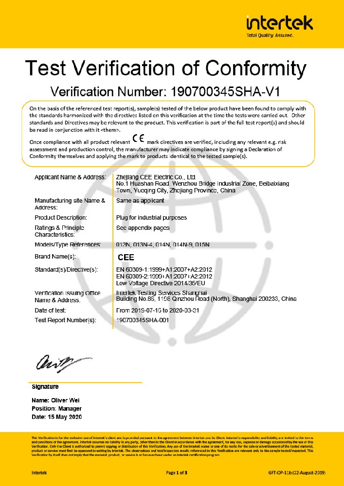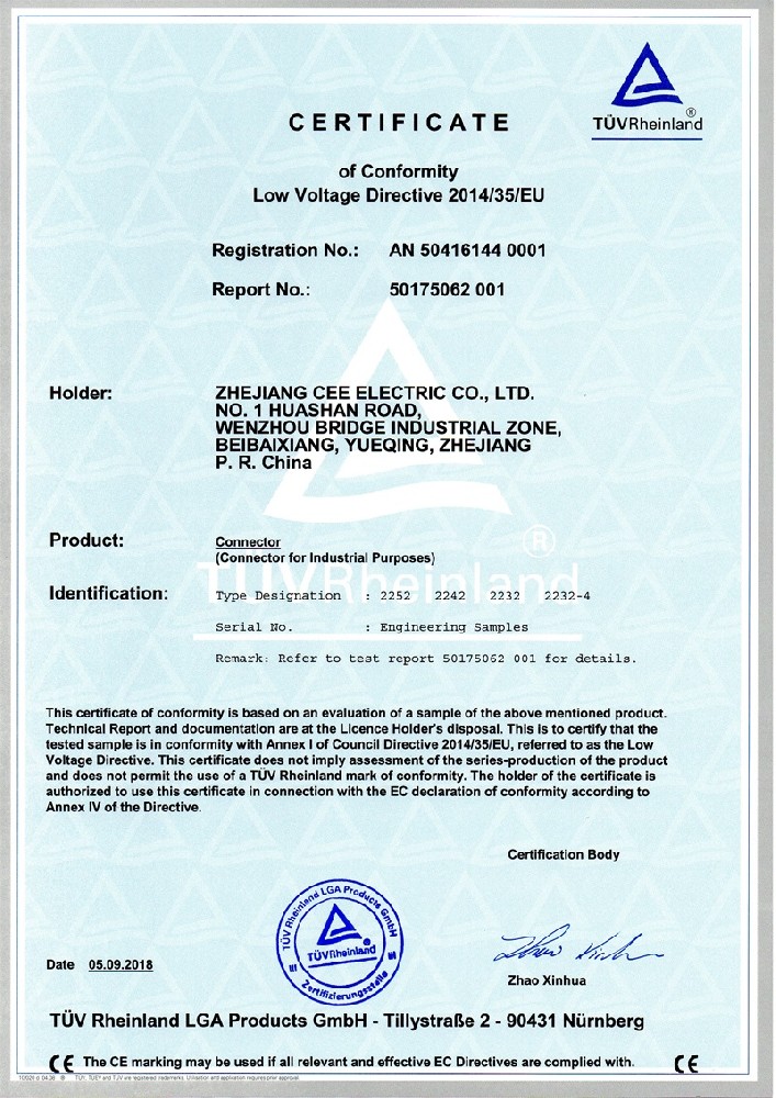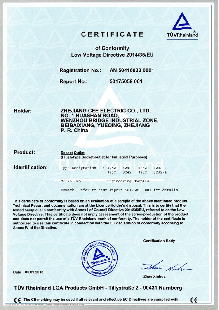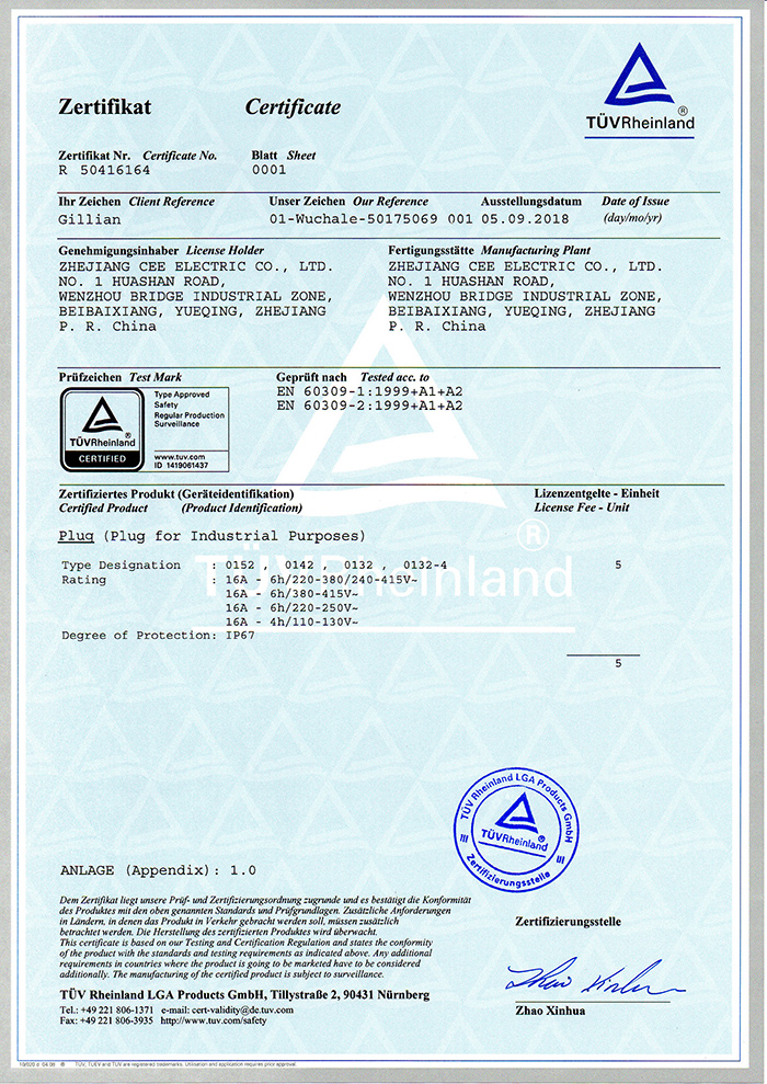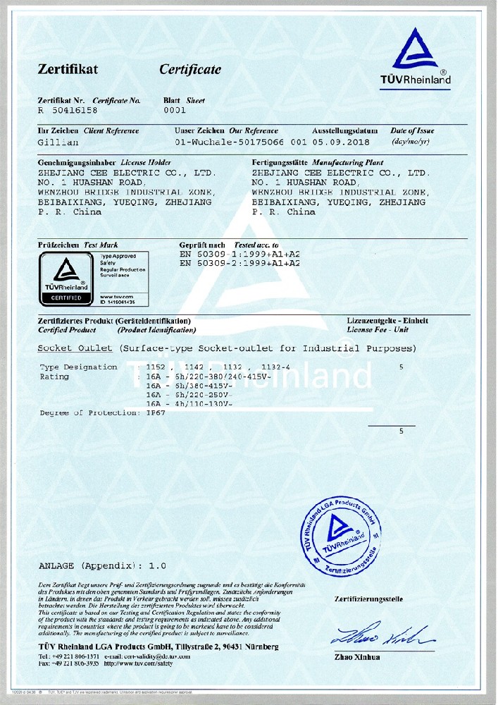 公司全面貫徹實(shí)施IS09001:2015質(zhì)量管理體系認(rèn)證。工業(yè)插頭插座符合IEC 603 09-1-2, EN 60 309-1-2國(guó)際標(biāo)準(zhǔn), 組合插座箱符合EN61439標(biāo)準(zhǔn),并通過(guò)Intertek & TUV Rheinland & CQC等認(rèn)證。證書(shū)包括TUV、SEMKO、CE、CB、EAC,并符合RoHS和Reach等適用法規(guī)。公司引進(jìn)先進(jìn)生產(chǎn)設(shè)備和精密檢測(cè)試驗(yàn)儀器、不斷引入高科技工藝流程和技術(shù)人才,為公司的產(chǎn)品研發(fā)、質(zhì)量升級(jí)、管理創(chuàng)新提供了強(qiáng)有力的保障。公司將持續(xù)以優(yōu)質(zhì)的產(chǎn)品和服務(wù),贏得客戶的最大滿意為宗旨,發(fā)揚(yáng)“創(chuàng)新、服務(wù)、溝通”的企業(yè)精神,力促CEE品牌從中國(guó)走向世界。我們牢牢把握時(shí)代賦予的使命和機(jī)遇,與海內(nèi)外合作伙伴共同開(kāi)創(chuàng)事業(yè)的新高度。